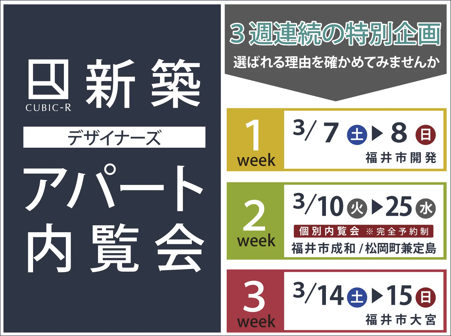 [3週連続!] 新築アパート内覧会 3/7-8福井市開発 3/10-25福井市成和/松岡町兼定島 3/14-15福井市大宮